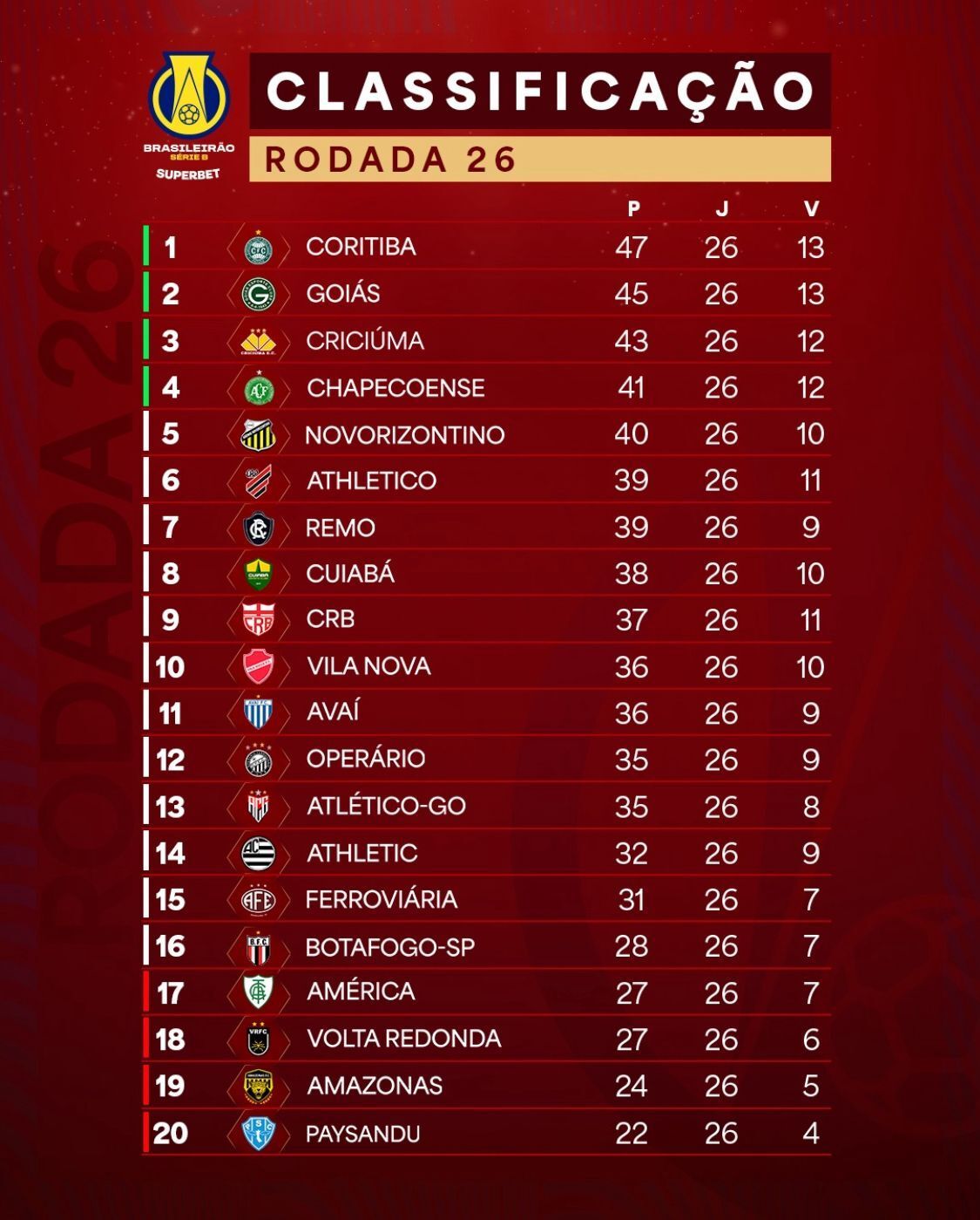 A 26ª rodada foi intensa, mas equilibrada: cinco empates, três sem gols e muita briga na parte de cima. O G4 não teve mudanças, mas do 5º ao 10º lugar ninguém perdeu, a luta pelo acesso segue acirrada! Veja a classificação como ficou!
