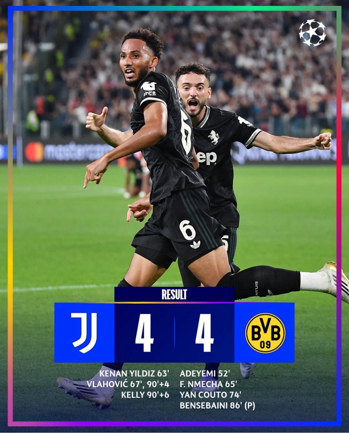 Mas os 👵🏻 italianos não desistiram e empataram com 2 gols nos acréscimos, teve outro do sérvio Vlahovic e aos 96' Kelly empatou com assistência do sérvio. Que jogo doido de bom! Um verdadeiro thriller europeu! A nata da Champions!