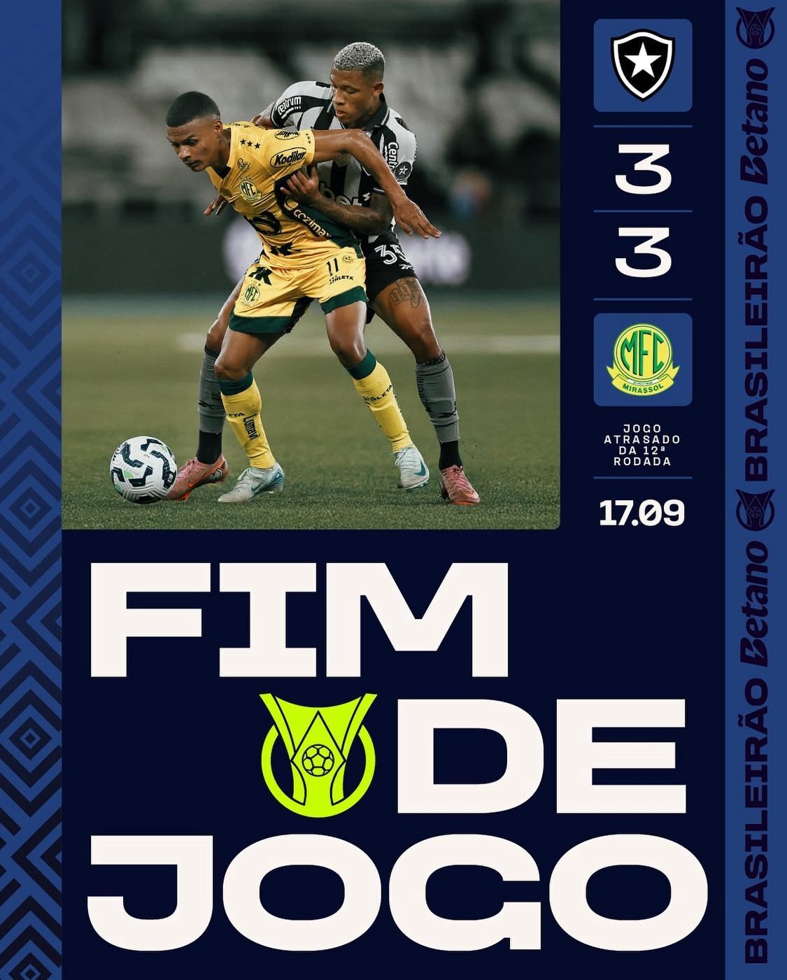 Noite de emoção no Nilton Santos! O Botafogo abriu 3 a 0 ainda no primeiro tempo, parecia caminho para goleada, mas viu o Mirassol reagir e arrancar um empate histórico em 3 a 3 na partida atrasada do Brasileirão.