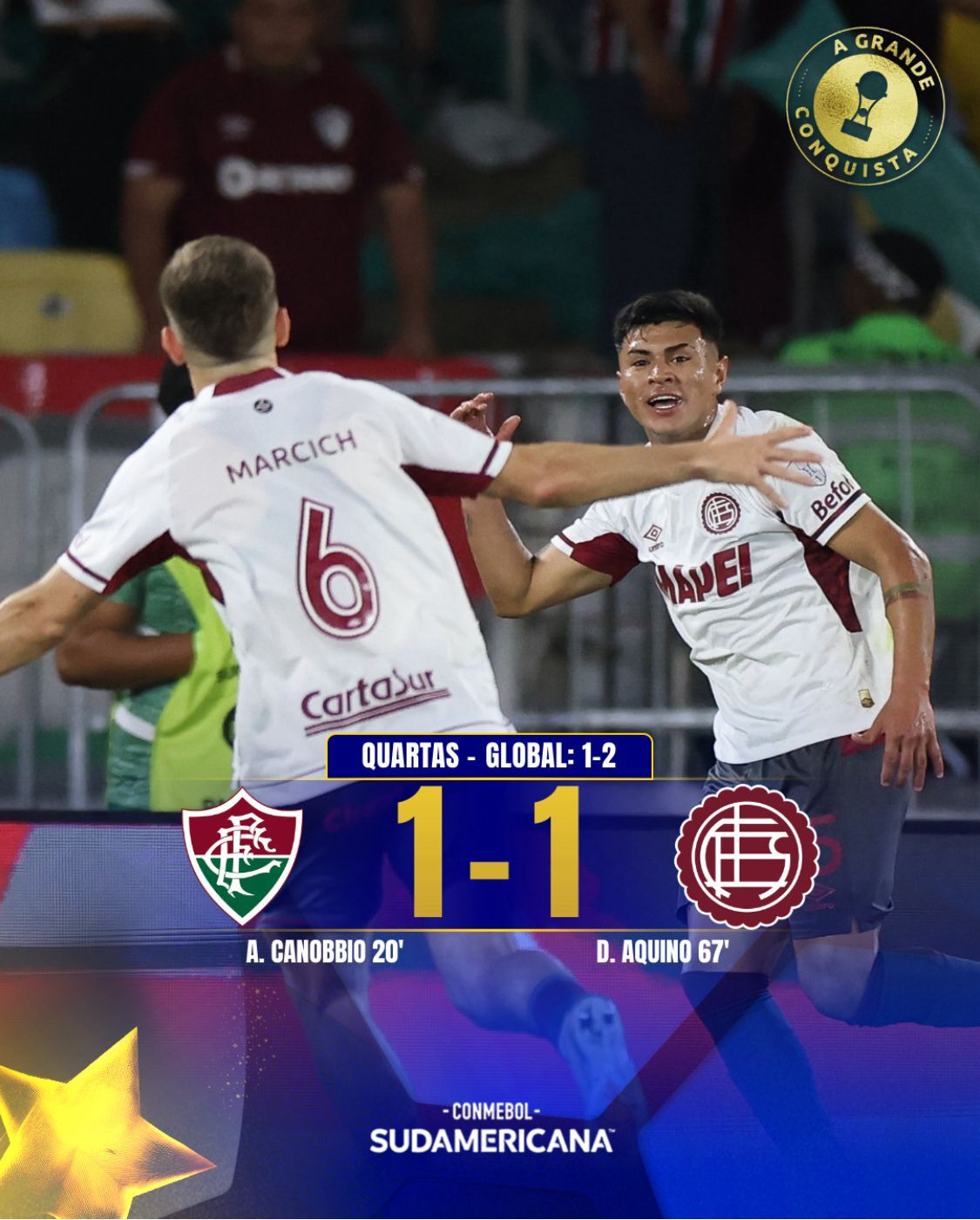 O Jogo começou intenso com o Tricolor Carioca empurrando o Lanús para trás e abrindo o placar em jogada aérea que terminou com um lindo voleio de Canobbio, um belo gol. Mas o ritmo caiu, o time recuou e, no segundo tempo, após um atraso de quase 30 minutos por briga entre torcedores argentinos e a Polícia, o castigo veio: Aquino empatou e classificou os argentinos.