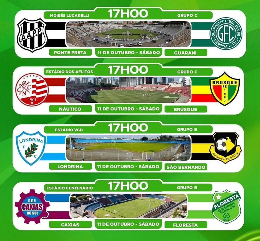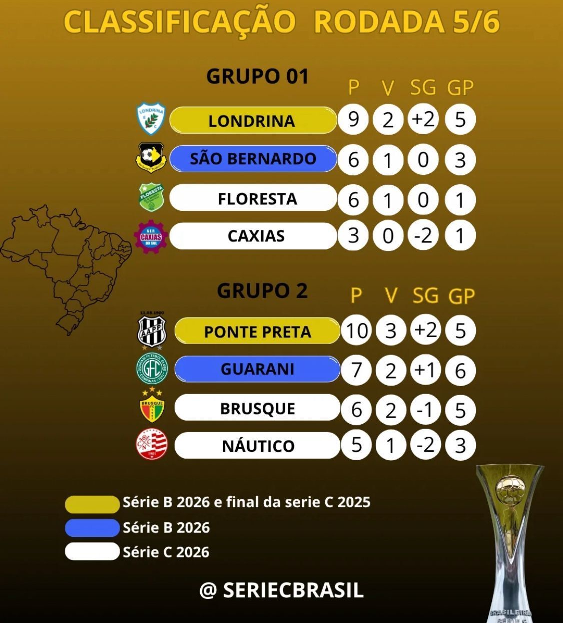 Grupo C: emoção pura! A Ponte já subiu e joga o dérbi apenas pela vaga na final, mas Guarani, Brusque e Náutico brigam ponto a ponto. O Bugre sobe se vencer a Macaca. Mas se perder, o confronto direto e até os cartões podem decidir o acesso. Guarani leva vantagem sobre Náutico e Brusque nesse critério, por enquanto.