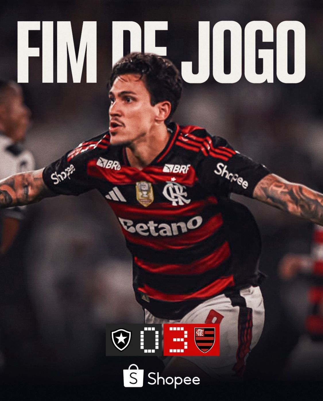 O 🟥⬛ Flamengo não tomou conhecimento do Botafogo no Nilton Santos e meteu 3 a 0 no rival, com show de Pedro, Luiz Araújo e Gonzalo Plata. O camisa 9 ainda completou 300 jogos pelo Mengão, que segue firme na caça ao líder. O clima agora é de “final antecipada”: domingo tem Flamengo x Palmeiras no Maracanã valendo a ponta da tabela!