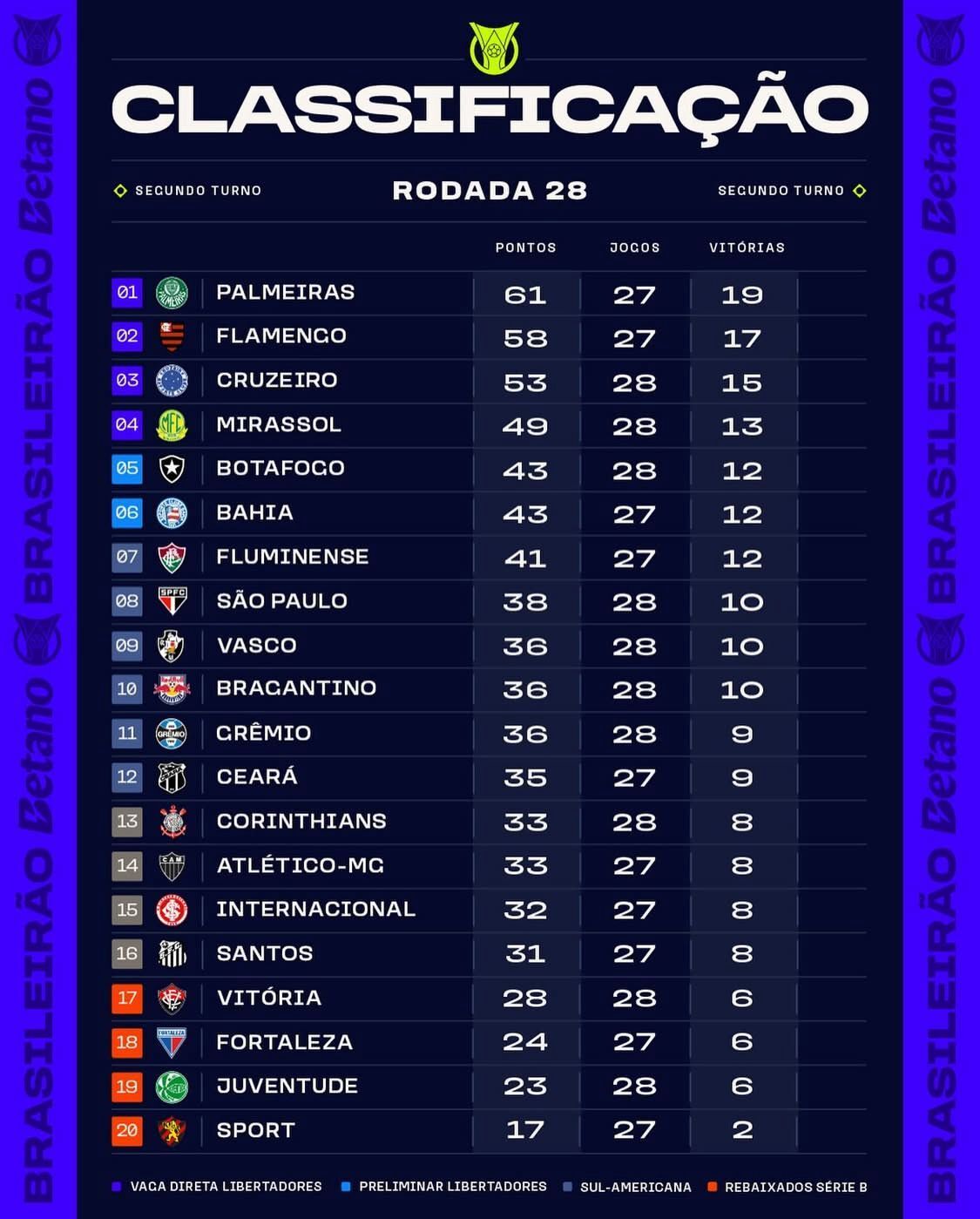 Na tabela, o G6 ainda tem Cruzeiro (53), Mirassol (49), Botafogo e Bahia (43). Lá embaixo, o drama é real: Vitória, Fortaleza, Juventude e Sport brigam pra fugir da degola. Veja a classificação: