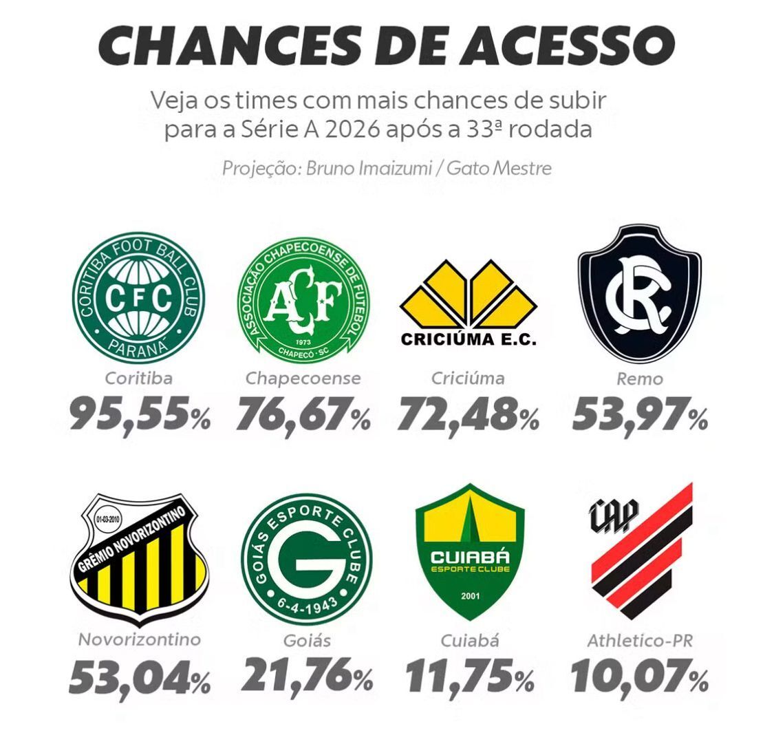 O Coritiba é o único tranquilo: não enfrenta ninguém direto. Já o Goiás pegou o modo hardcore: todos os últimos 5 jogos são contra rivais do G4. Chance de acesso hoje? 21,76%.