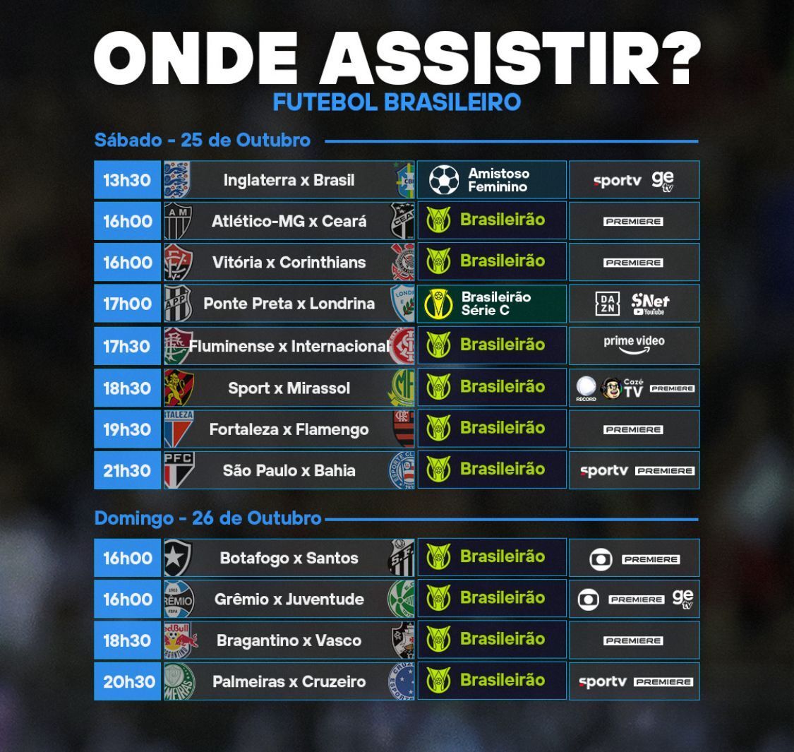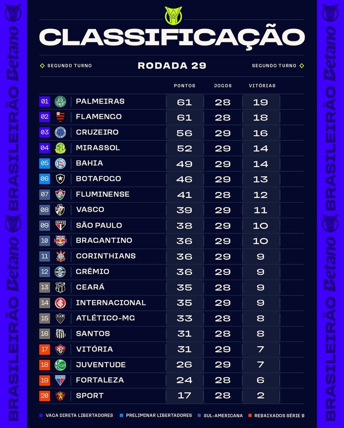 Enquanto isso, a parte de baixo da tabela segue pegando fogo! Juventude e Vitória ainda acreditam na salvação, mas terão pedreiras pela frente. O Ju encara o clássico contra o Grêmio em Porto Alegre, e o Leão recebe o Corinthians em Salvador, dois confrontos que prometem tensão até o apito final.