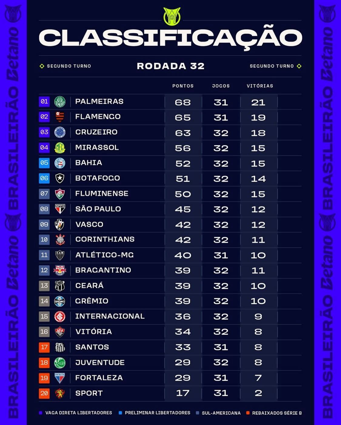 Simulação da rodada: Sport 2 x 2 Atlético-MG, Vasco 2 x 0 Juventude, Inter 1 x 0 Bahia, São Paulo 2 x 1 RB Bragantino, Vitória 0 x 0 Botafogo, Cruzeiro 1 x 0 Fluminense, Corinthians 2 x 2 Ceará, Flamengo 3 x 0 Santos, Mirassol 2 x 1 Palmeiras e pra fechar Fortaleza 1 x 0 Grêmio!