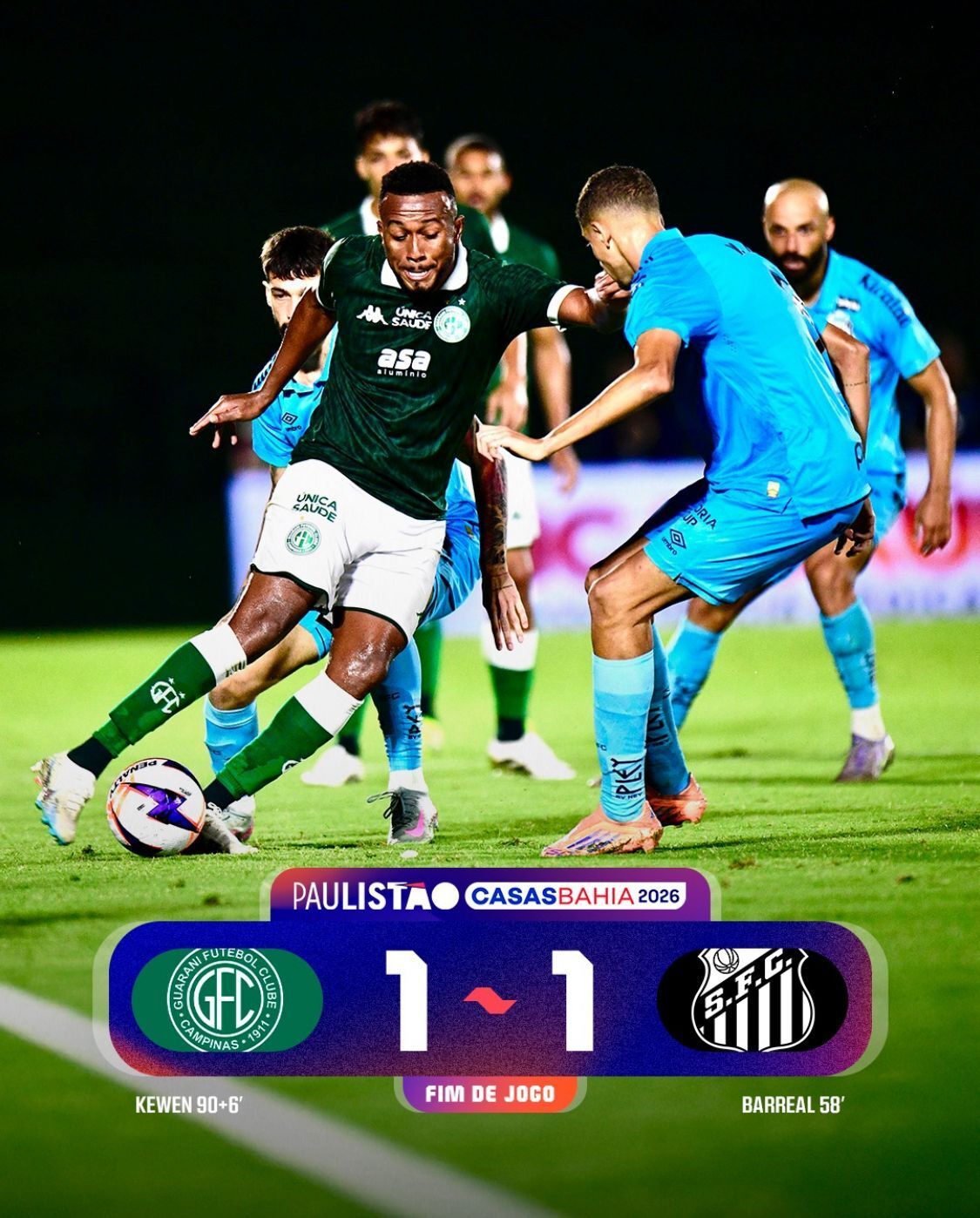 Já em Campinas, o roteiro foi cruel (para os santistas). O Santos vencia até os 51 do segundo tempo, teve pênalti defendido por Brazão, controlou o jogo… e mesmo assim deixou escapar. Kewen, de cabeça, arrancou o empate para o Guarani no último lance (é histórico, sempre a base do Bugre salvando a equipe). Resultado: frustração santista, sensação de dois pontos perdidos e a certeza de que, no Paulistão, desligar antes do apito final é pedir castigo…